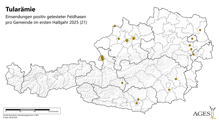 In 2024, 117 cases of disease in humans were reported in Austria (as at 3 February 2025, see annual statistics on notifiable infectious diseases). In brown hares, tularaemia was confirmed in 21 animals in 2025 (as at 15/07/2025). Since 2018, an endemic occurrence of tularaemia in brown hares has also been detected in western Austria, with a high number of positive hares mainly from Salzburg and Upper Austria. In November 2023, tularaemia was detected for the first time in a hare in Carinthia.