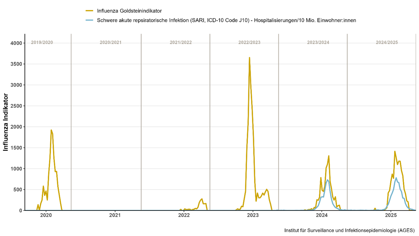 - Influenza Goldstein indicator from data from the ILI sentinel surveillance system (influenza-like-illness) and the positivity rate of the virological sentinel system DINÖ (Diagnostic Influenza Network Austria)