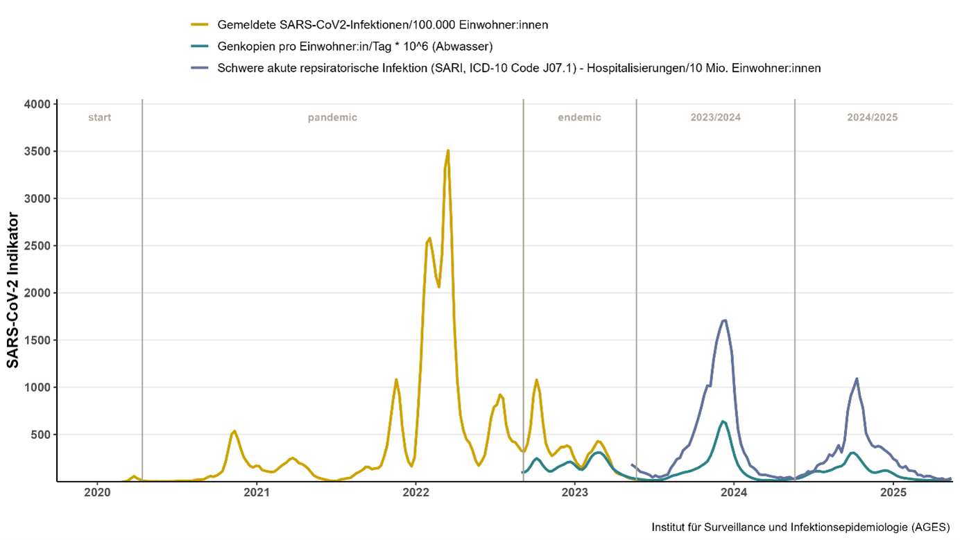 The new model became particularly relevant after the end of the COVID-19 reporting obligation on 30 June 2023. In contrast to established respiratory pathogens, with an emerging pandemic pathogen such as SARS-CoV-2, it can be assumed that special attention was paid in the early phase to recording deaths as completely and correctly as possible. In Austria, testing was also particularly intensive, which enabled a high level of diagnostic coverage and thus a more precise classification of deaths. With the abolition of mandatory reporting and the decline in public interest, COVID-19 has increasingly joined the ranks of established respiratory pathogens, which makes an increasing underreporting of deaths likely. In order to continue to epidemiologically assess the impact of SARS-CoV-2 circulation on mortality, the model has been adapted and now relies more heavily on surveillance data from other sources: wastewater monitoring and electronic health data on hospital admissions with severe acute respiratory infections(SARI).
