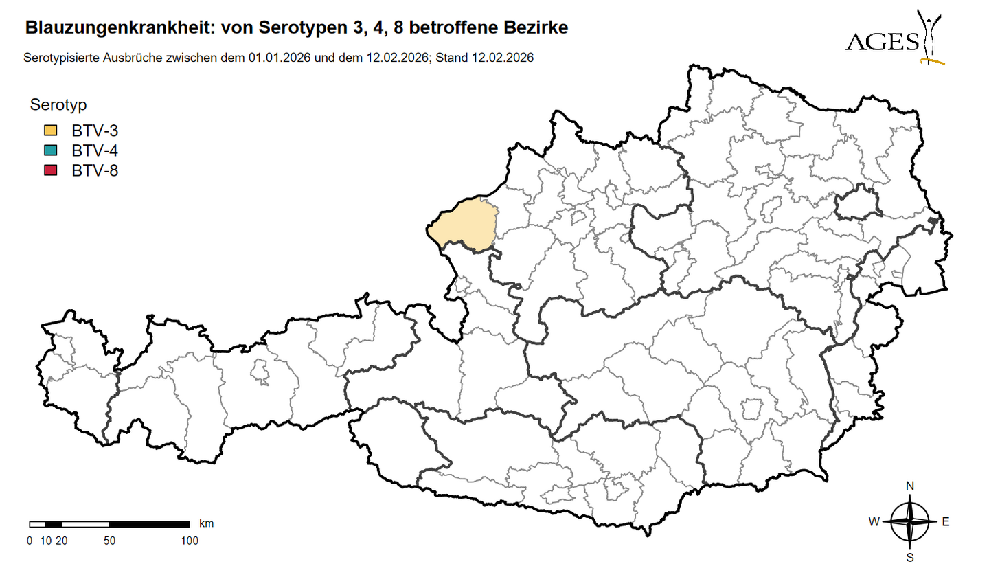 Bluetongue occurs almost worldwide. In 2023, a specific serotype of the virus, BTV-3, appeared for the first time in the Netherlands, Belgium and Germany. Since then, BTV-3 has continued to spread in Europe, and Austria has also been affected by BTV infections with two serotypes of BTV (BTV-3 and BTV-4) since September 2024. At the beginning of August 2025, a third serotype was added with BTV-8, which presumably reached our country from the south. BTV-8 has so far occurred in several European countries, including Switzerland and Italy. In addition, BTV-8 has recently been increasingly reported from several Balkan countries.