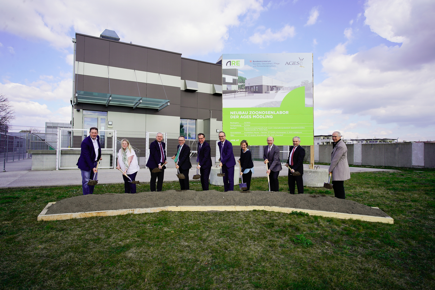 Avian influenza, coronavirus (Sars-CoV-2) or West Nile virus - alongside climate change and antibiotic-resistant germs, zoonotic infectious diseases are among the greatest health challenges of the 21st century. To meet these challenges scientifically, a new, state-of-the-art zoonoses laboratory is being built at the AGES site in Mödling. "Zoonoses are a growing problem for public health, food safety and animal health. The new zoonoses laboratory will create the conditions to further strengthen AGES' expertise in monitoring and research," said AGES CEOs Thomas Kickinger and Anton Reinl at the groundbreaking ceremony with representatives of the Ministry of Health and Mödling Mayor Hans Stefan Hintner.