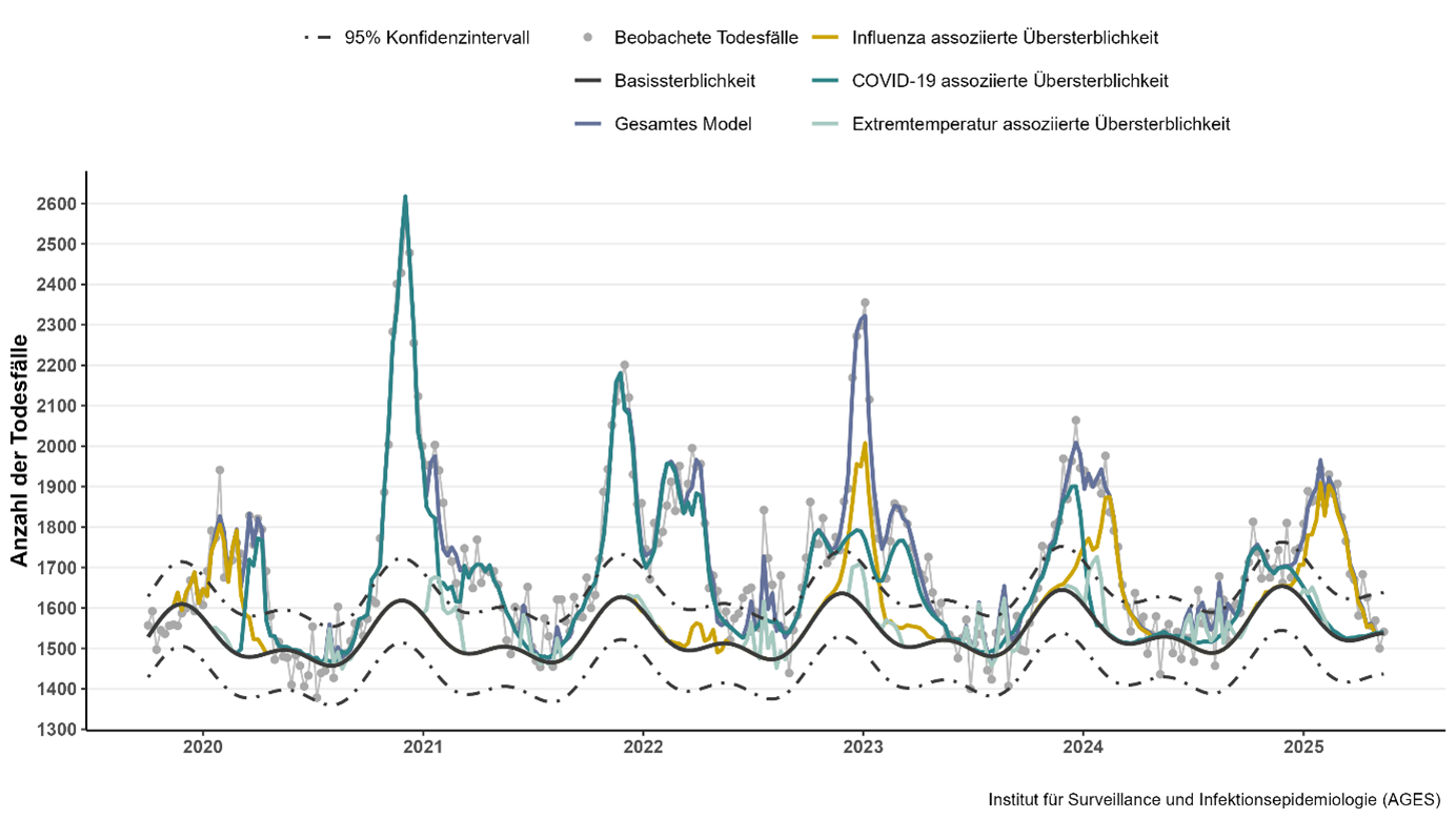 Seit der Influenza Saison 2015/2016 wird in Österreich ein Modell zur Schätzung der Influenza-assoziierten Übersterblichkeit eingesetzt. Mit dem Auftreten von SARS-CoV-2 ab dem Jahr 2020 und dessen gleichzeitiger Zirkulation mit saisonaler Influenza, die ein ähnliches Krankheitsbild aufweist, wurde eine Erweiterung dieses Modells erforderlich. Ziel war es, eine Überschätzung der Influenza-bedingten Sterblichkeit zu vermeiden und die durch COVID-19 verursachte Übersterblichkeit differenziert zu erfassen.