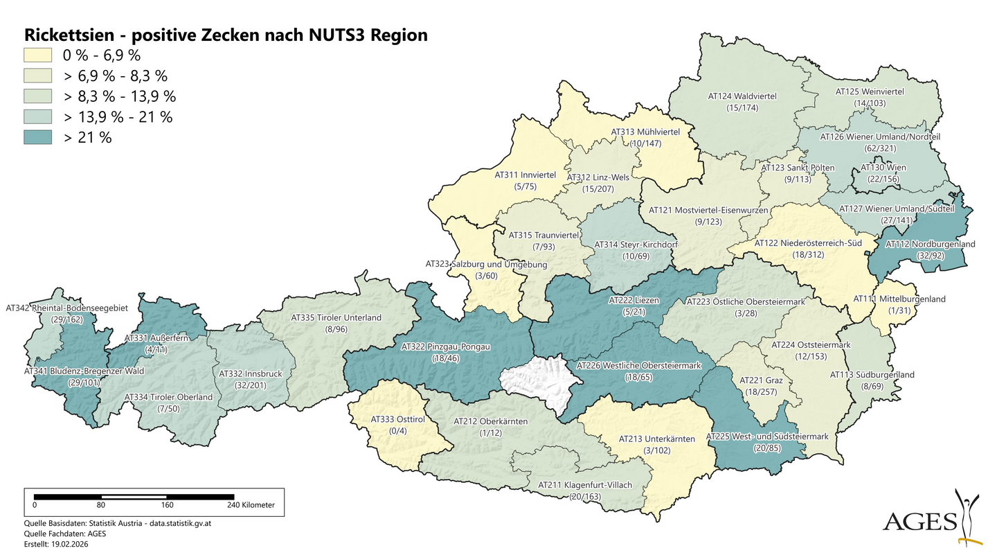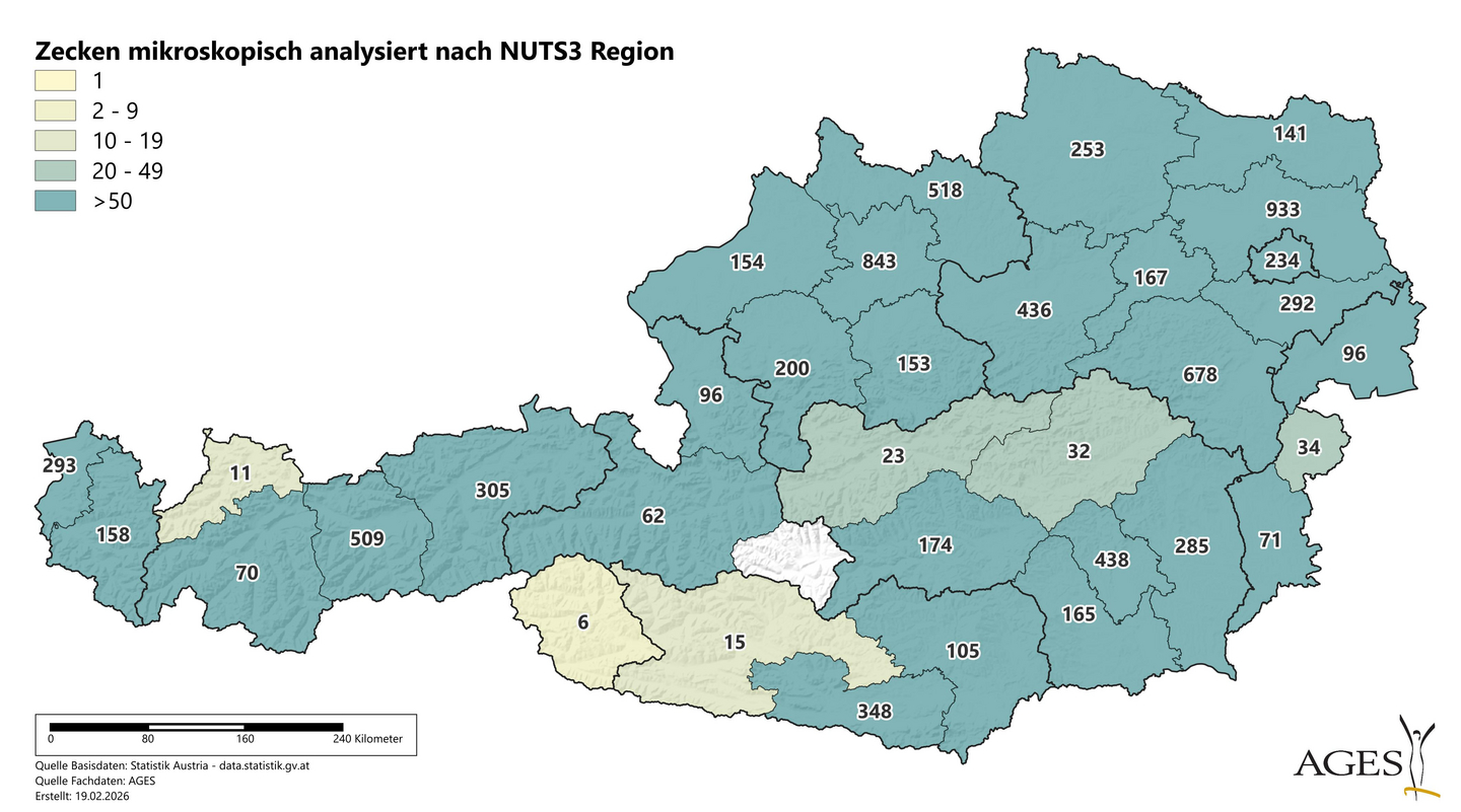 Den größten Anteil der Zecken stellten Zecken der Gattung Ixodes (96,4 %), gefolgt von Dermacentor (3,1 %) und Haemaphysalis (0,5 %). Die meisten Zecken erhielten wir aus Niederösterreich (35,1 %), gefolgt von Oberösterreich (22,5 %), der Steiermark (13,4 %), Tirol (10,9 %), Kärnten (5,6 %), Vorarlberg (5,4 %), Wien (2,8 %), dem Burgenland (2,3 %) und Salzburg (1,9 %).