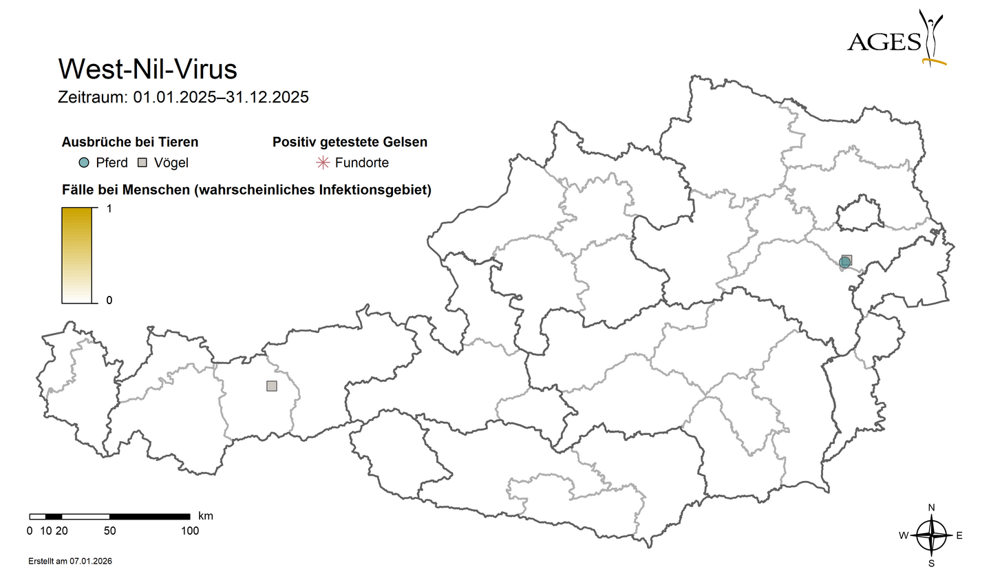 Im Jahr 2025 gab es drei gemeldete West-Nil-Virus-Infektionen bei Tieren und einen importierten Fall beim Menschen (Stand 31.12.2025).